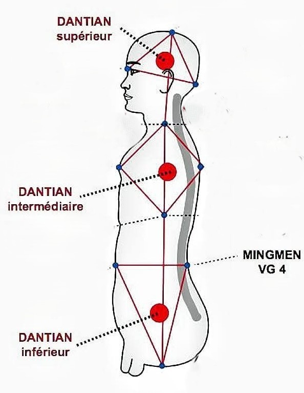 Le Dan Tian moyen : (QI) situé au cœur, c’est une énergie créée à partir de la nourriture et de l’air et se rapporte à nos émotions et nos pensées.